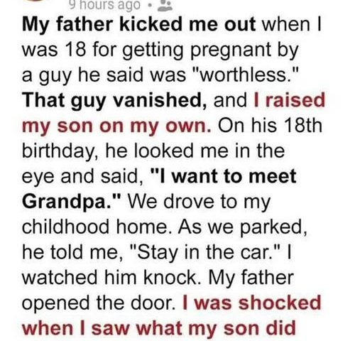 That guy vanished, and I raised my son on my own. On his 18th birthday, he looked me in the eye and said, “I want to meet Grandpa.” We drove to my childhood home.