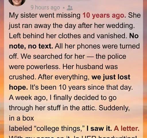 My sister disappeared ten years ago. The morning after her wedding, she simply vanished. Her clothes were left behind. No message, no explanation. Every phone she owned was switched off. We searched everywhere, but the police found nothing. Her husband was devastated. As time passed, hope slowly faded. Ten years went by in silence.