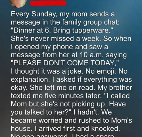 So when she sent a brief text one Sunday afternoon that simply said, “Please don’t come today,” my heart sank. No explanation. No smiley face. Just five unsettling words. My brother and I exchanged a look and knew instantly something was wrong. We ignored the message, got into the car, and drove straight to her house, anxiety tightening in our chests.
