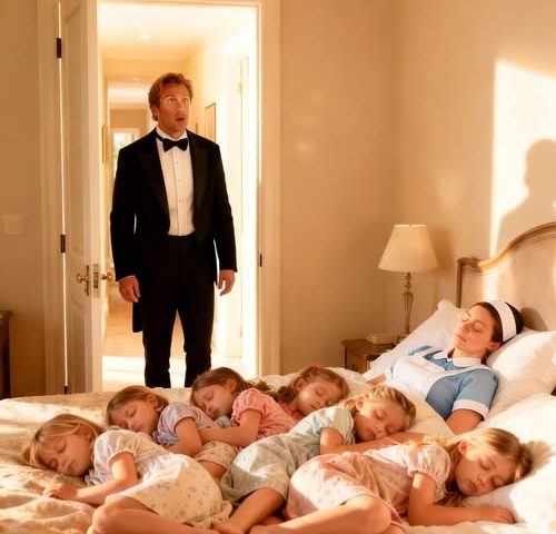Six girls stood watching from the stairs. Hazel, twelve, her posture rigid. Brooke, ten, pulling at her sleeves. Ivy, nine, eyes darting. June, eight, pale and quiet. The twins Cora and Mae, six, smiling with too much intention. And Lena, three, clutching a torn stuffed rabbit.