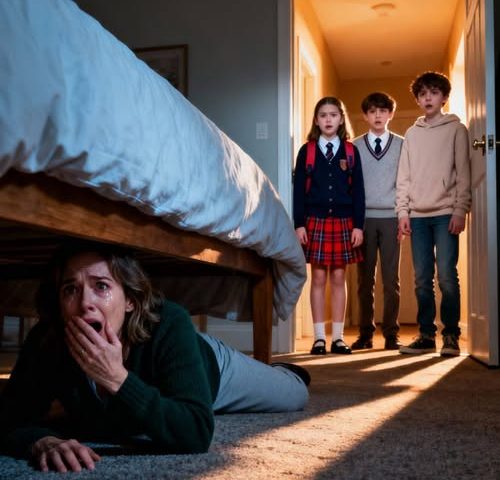 I stayed still beneath the bed as the footsteps moved through the hallway. Several children’s voices—three, maybe four. My heart pounded.
