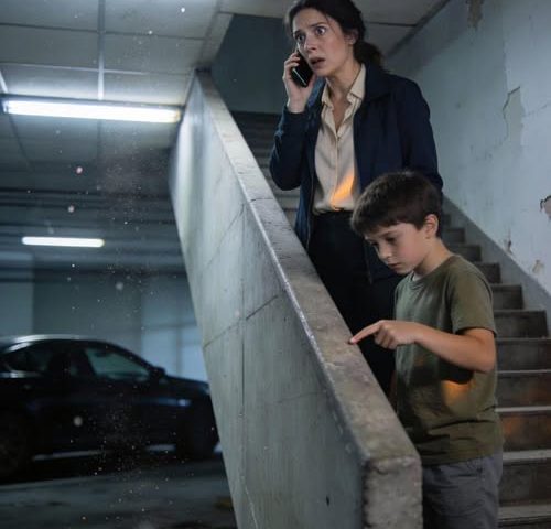 “Mom,” he whispered, pointing toward the ramp leading underground. “That’s Dad’s car.”