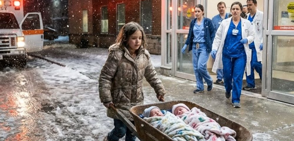 After more than eight kilometers , she arrived at the regional hospital. Her legs were trembling. She pushed the wheelbarrow to the emergency room entrance and shouted at the top of her lungs. Nurses and patients froze at the sight: an exhausted little girl, two babies purple with cold, and tears streaming down her face.
