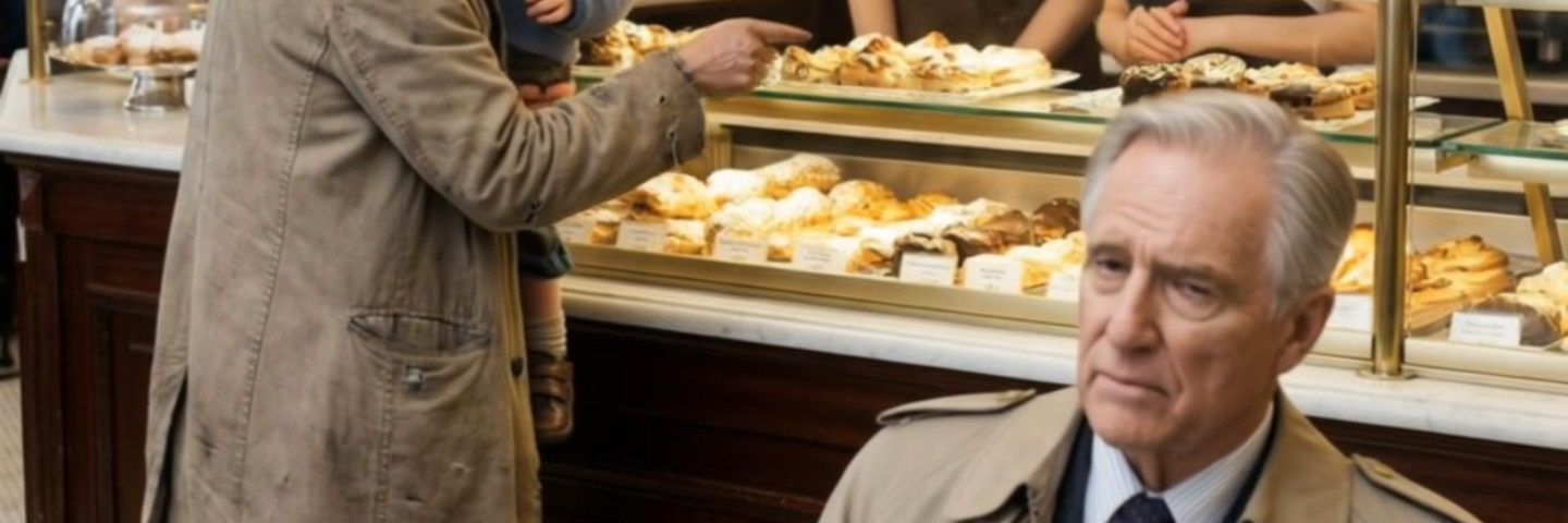 At a small marble table near the window sat an older man in a tailored beige coat. A newspaper lay folded in his hands, untouched. His eyes—sharp, observant—were fixed on the counter.