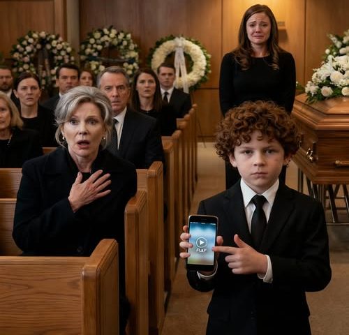At my husband’s funeral, his mother fixed her eyes on me and said with chilling calm, “It’s better he’s gone than forced to live with the shame she caused him.” A few relatives murmured in agreement, some even nodding. Before I could find my voice, my eight-year-old son stood up, clutching his father’s phone tightly. “Grandma,” he said evenly, “do you want me to play the message Dad recorded about you last week?” Her face drained of color as the room dropped into complete silence.