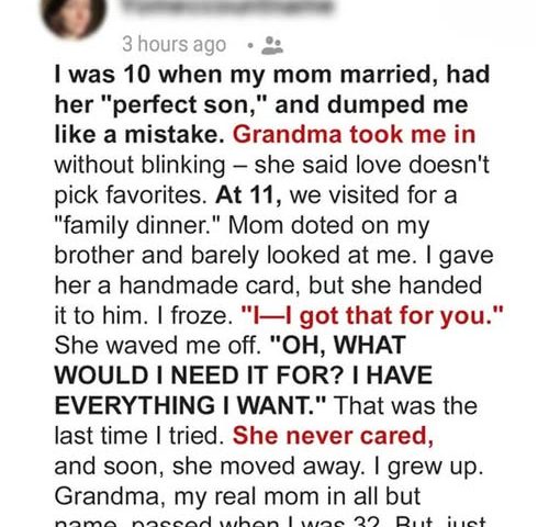 When I was ten, my mother decided I didn’t fit into her new “picture-perfect” life, so she left me with my grandmother and walked away—never once looking back.
