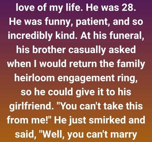 I was standing near the church steps, just trying to breathe, when Jake’s brother Jim walked over. I barely looked at him—I couldn’t focus on anything—but he put his hand on my arm and said, “So, uh… when do you think you’ll give the ring back?”