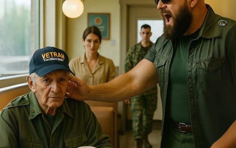 The slap cracked across his cheek. His cap tumbled to the floor, coffee spilling across the table. A waitress gasped; a mother shielded her child’s eyes. The biker chuckled darkly. “Should’ve stayed gone, soldier.”
