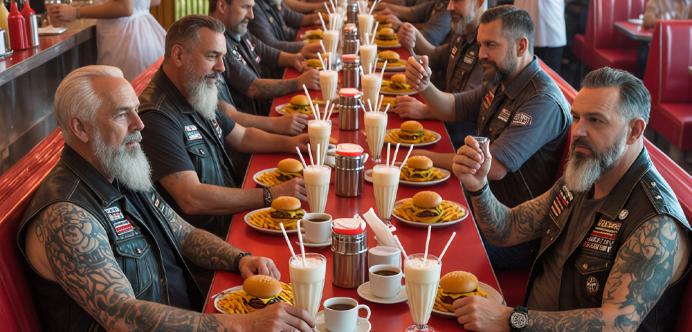 For the first hour, it was almost normal. They laughed, devoured burgers, argued over milkshakes like high school linemen. One with a beard to his chest complimented my coffee. My fists unclenched. I was just a waitress. They were just a table. A very large, very loud table.