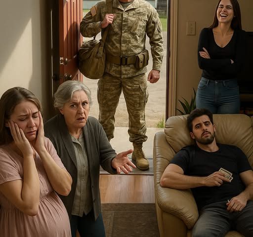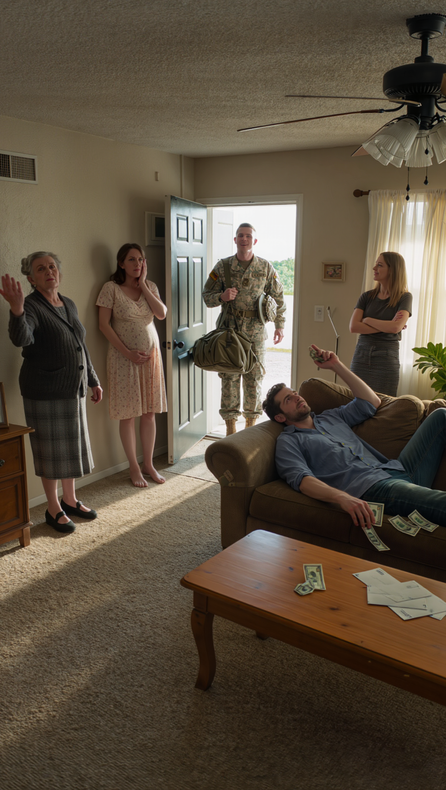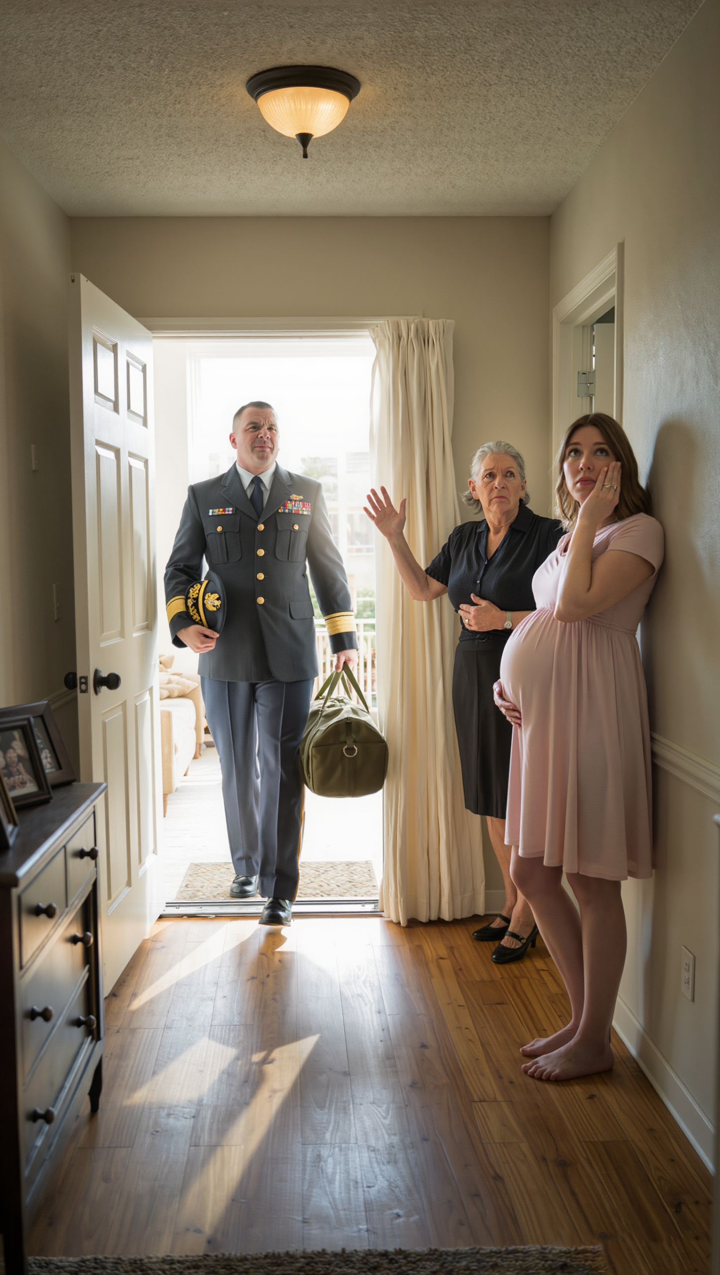 My husband stood in full uniform, duffel on his shoulder, cap tucked under one arm. For one breathtaking heartbeat, his face was pure joy—he’d come home early to surprise me. Then his gaze swept the room: his mother’s raised hand, Monica’s curled lip, Brett’s fist full of cash. The joy burned away.
