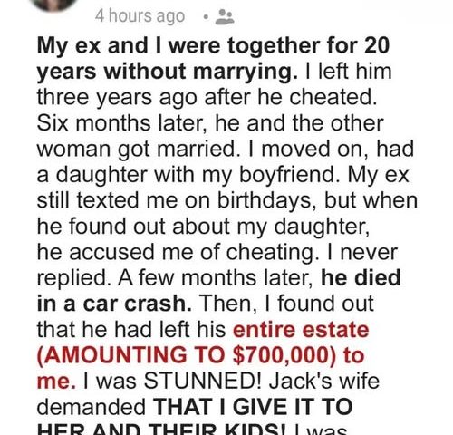 I was completely stunned. His current wife and children weren’t mentioned at all, and she immediately insisted that I hand everything over to her.