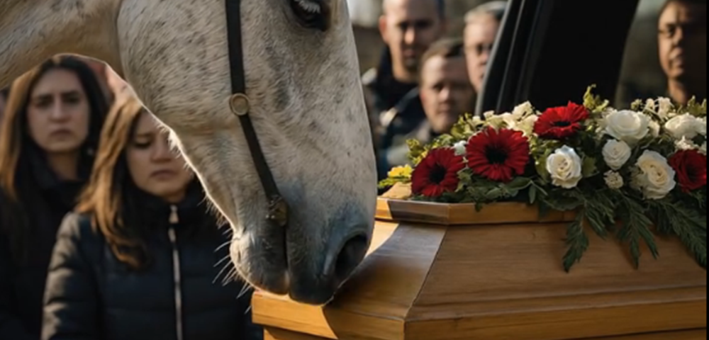 The horse simply stood there, head bowed, the tip of his muzzle resting gently against the coffin’s wooden surface. For a long moment, nothing happened — only the quiet sound of rain tapping against umbrellas and the muffled sobs of the mourners.