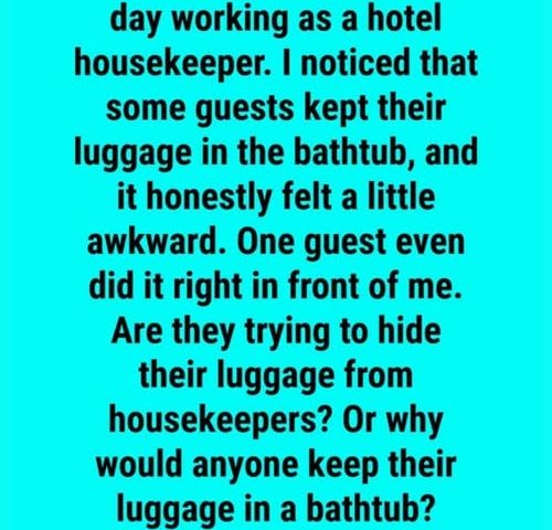 Later that week, I met an elderly couple while cleaning their suite. Their suitcase, too, sat neatly in the tub. Curious, I asked about it. The husband gave me a kind smile and said,