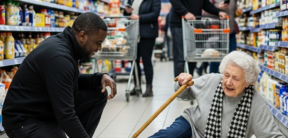 Near the end of the aisle, her toe caught the edge of a floor mat. Pain flashed like lightning. The cane skittered away. She crumpled to the cold tile, a soft cry swallowed by the store’s noise.