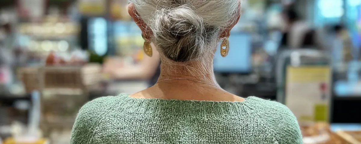In front of us stood an elderly woman who looked to be in her late 70s. Her hair was pinned back in a soft bun, wisps of silver curling near her ears. She wore a pale green cardigan that looked well-loved, the elbows stretched from years of wear.