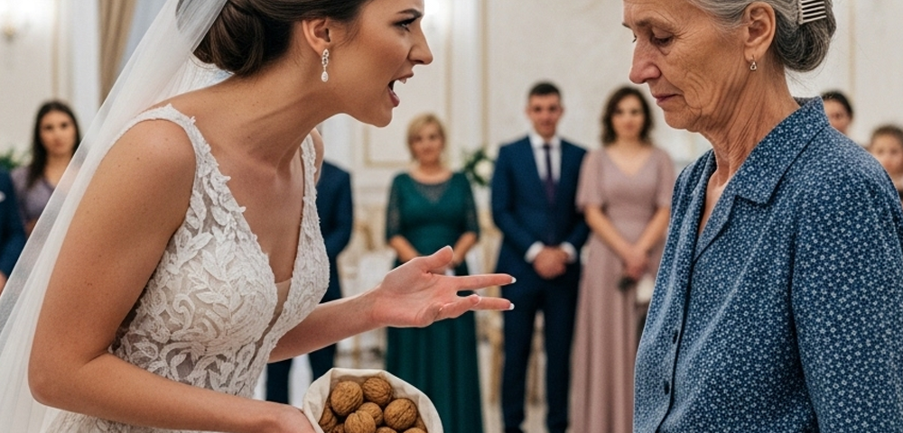 “Seriously?” I hissed, forgetting who I was talking to. “It’s a bag of walnuts. This is a luxury wedding, Grandma. You brought… this?” I heard myself and doubled down. “You’re embarrassing me. Please… just leave.”