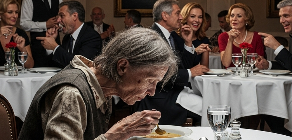 From the next table, laughter fizzed like champagne. “She’s here for hot water,” someone murmured. “In that coat.” Another guest snapped a photo as if kindness were a spectacle. The hostess pretended not to hear; a busser looked at his shoes. Only Luis kept his gaze gentle.