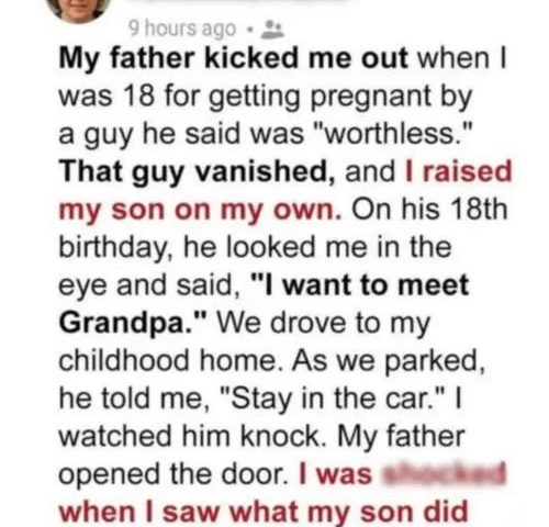 Liam grew up watching my struggles and determination, and that resilience became part of him. By fifteen, he was repairing cars at a local shop, and by seventeen, clients were asking for him by name. On his eighteenth birthday, I asked him what he wanted. Instead of a gift, he said he wanted to meet the grandfather he had never known — not to argue, but to find closure. My heart raced as we drove to that old house, the place where my story had once ended.